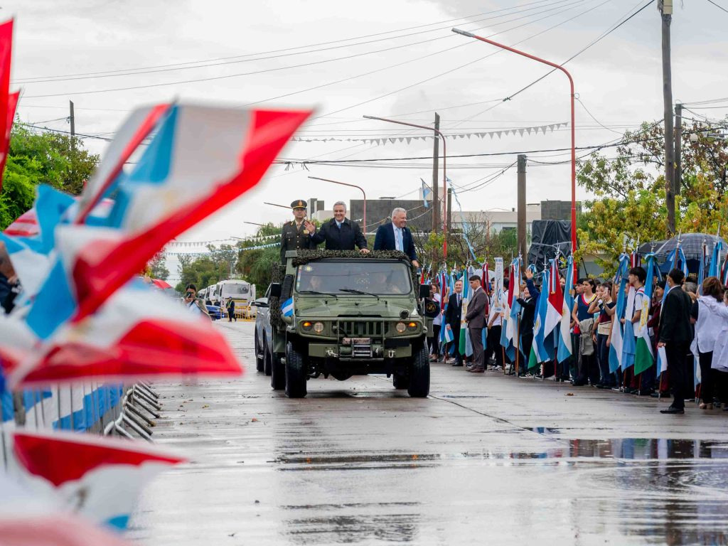 A pesar del clima lluvioso, miles de vecinos se reunieron en la avenida principal, acompañando, homenajeando y aplaudiendo el paso de los héroes y fuerzas que participaron del desfile cívico-militar.